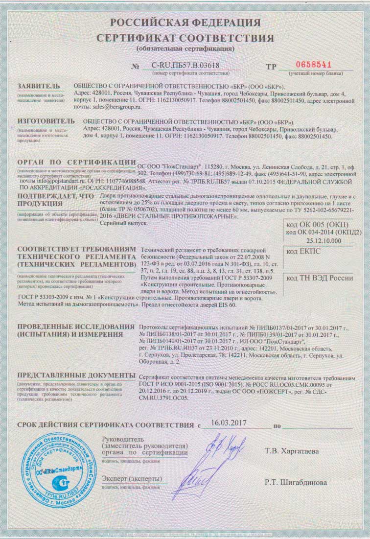ГОСТ Р57327-2016 «Двери металлические противопожарные. Общие технические требования и методы испытаний». Двери соответствуют ТР ЕАЭС 043/2017.