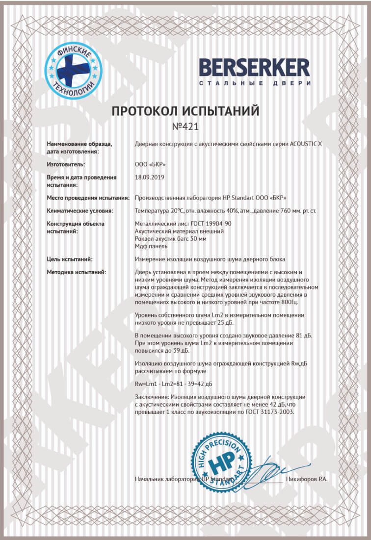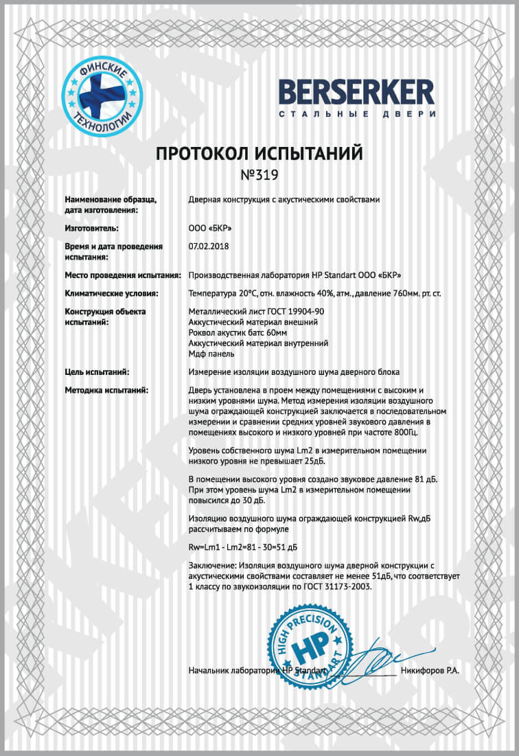 Двери соответствуют всем стандартам качества и протоколам испытаний: